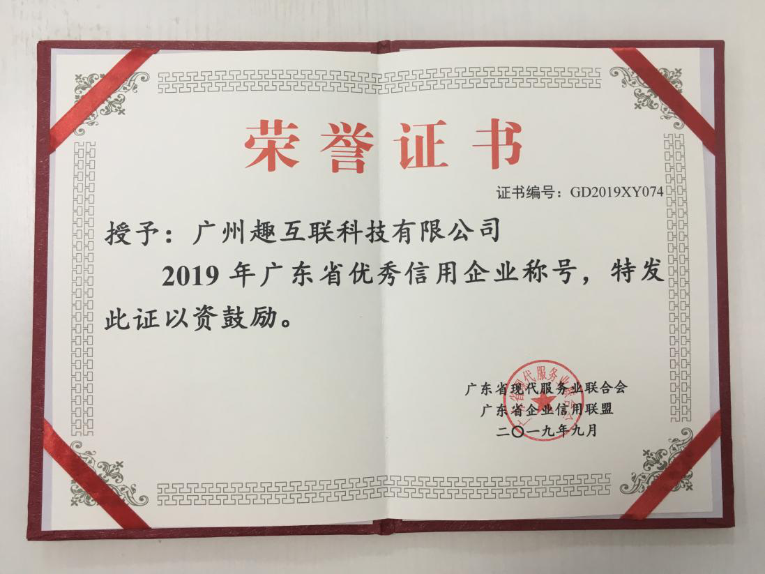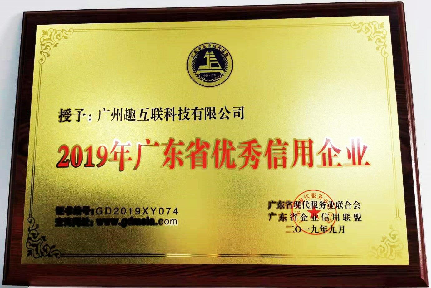 近日,由广东省发改委指导,广东省企业信用联盟、广东省现代服务业联合会、广东省电子商务协会联合主办的“2019年广东省优秀信用企业”评选活动告一段落, 广州趣互联科技荣获“ 2019年广东省优秀信用企业”称号。