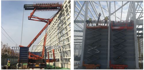 建设期间,项目钢结构仓库采用机械化施工、屋面板施工采用车载式高空上瓦设备,由厂家直接发货至现场加工,节省了异地加工及现场倒运等多道工序,有效提高了施工效率,同时可实现屋面瓦的整板加工,避免了屋面板多板拼接导致的屋面渗漏隐患,隔墙板及消防工程采用电动屈臂车,避免搭设脚手架操作平台,进一步提升了施工进度及工效。