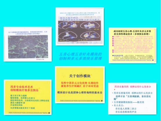 答(陈世英):创制应用包括先创作单元模块部分,再创制多模块多元交替融合的形式、多种作用效果融于一场团体对象,例如以优化针灸、五音五色疗法、语言认知注意记忆模块和视听动说美融于一场团体对象的语言运动认知功能康复,在五音针灸五色调五脏、系列模块激发大脑潜能下做康复训练,由于具备独创性,获得国家版权和商标注册认证,因以中华传统多元文化孕育创制,跨现代多学科技术艺术,该系列不仅是中国特有,也会是世界特有,获得的中医成果和荣誉,是中医现代化的践行探索。见图。
